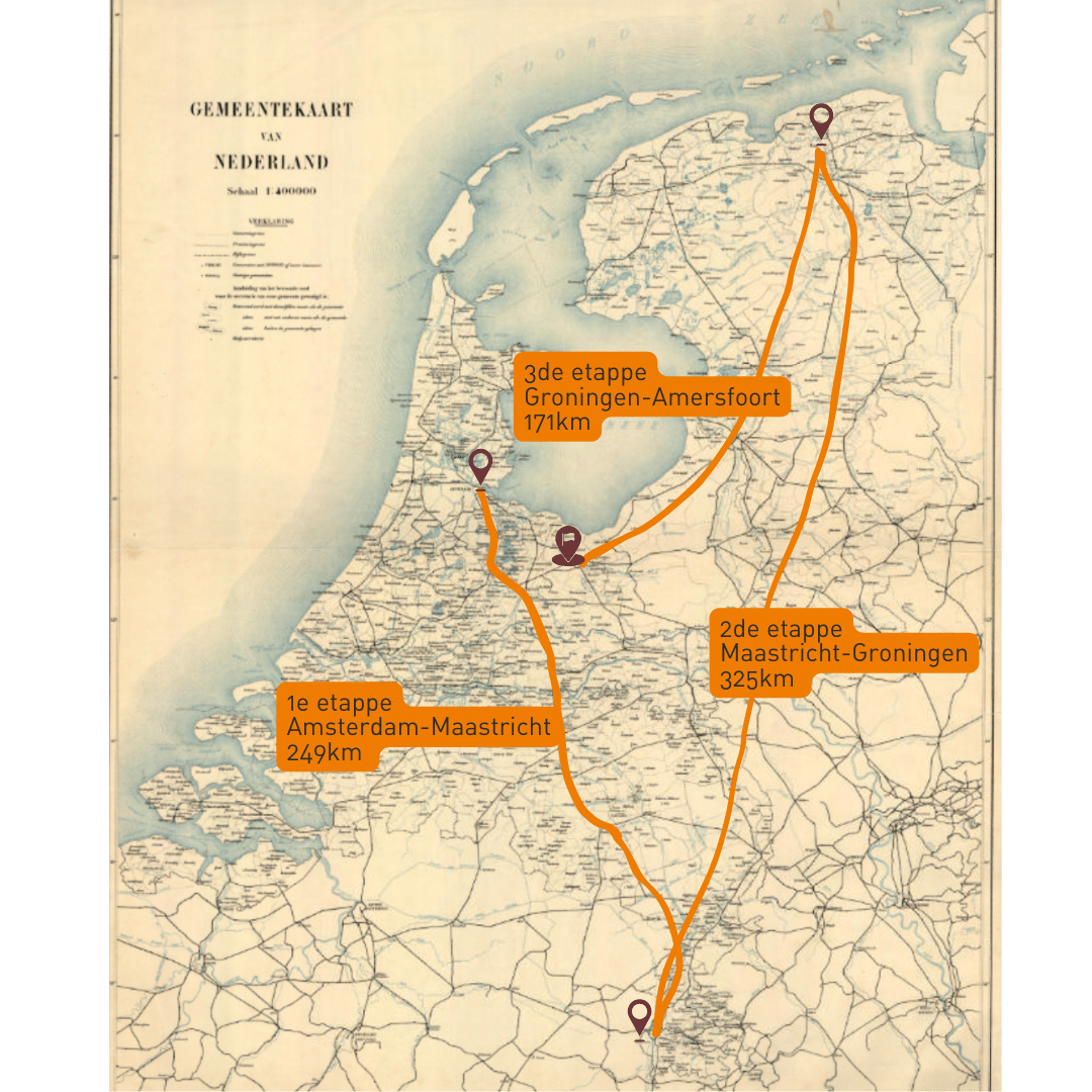 De start was vanaf het Rembrandtplein in Amsterdam. De prijsuitreiking was in De Kroon. De finish was in Amersfoort. Ze reden gemiddelde snelheden van 28km/uur. Over landwegen met eenvoudige racefietsen, vaak van het merk Rover. Meerdere fietsmerken werden uiteindelijk automerken. Zo ook zijn er bekende autoclubs die zijn ontstaan uit de wielerij.