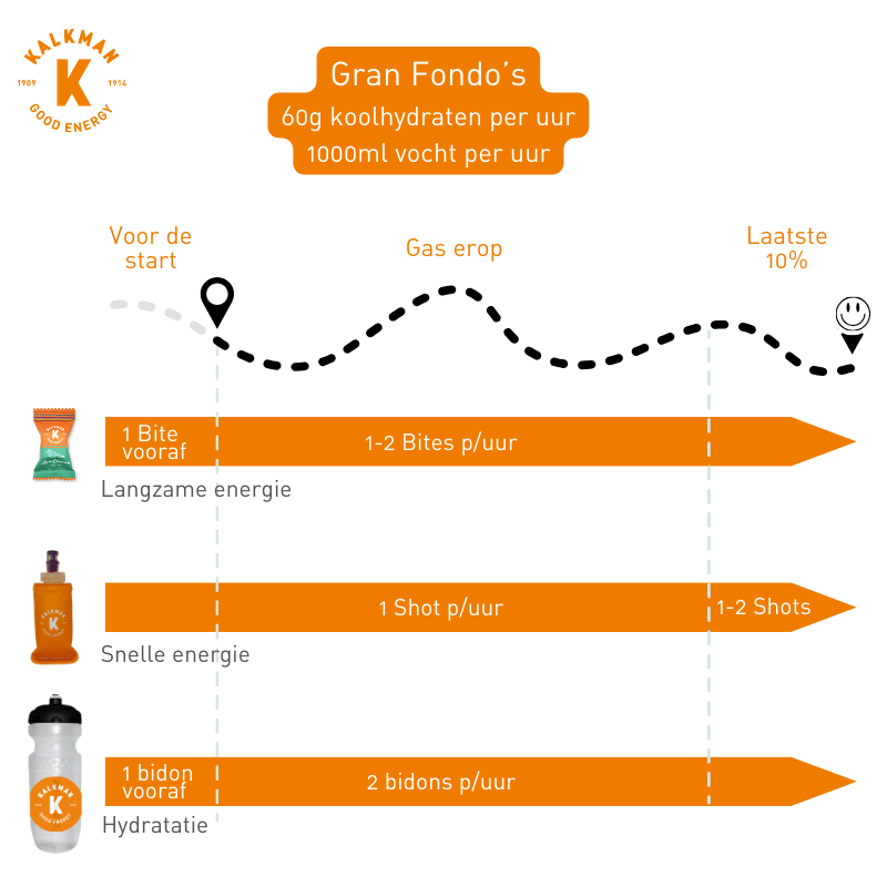 Vaak vergeten we tijdens een Gran Fondo wanneer en wat te eten en te drinken, wat je rijplezier kan verminderen. Met de uitdaging van de lange afstand en intensiteit van zo een klim is het essentieel om je energieniveaus op peil te houden. Je streeft typisch naar een inname van 60g koolhydraten per uur en 1000ml drinken per uur. Hoge temperaturen zijn hierbij belangrijk om in de gaten te houden. Onze handige portieverpakkingen bevatten elk ongeveer 15g koolhydraten, zodat je met 1 Energy Bites, 1 Energy Shots en 2 bidons Hydro Drink de 60g per uur bereikt. Houd altijd rekening met individuele factoren zoals lichaamsgewicht en weersomstandigheden. En eet vooral wel bij een opwarm-ritje of de dag voor de grote klim, dit helpt met je herstel de volgende dag.