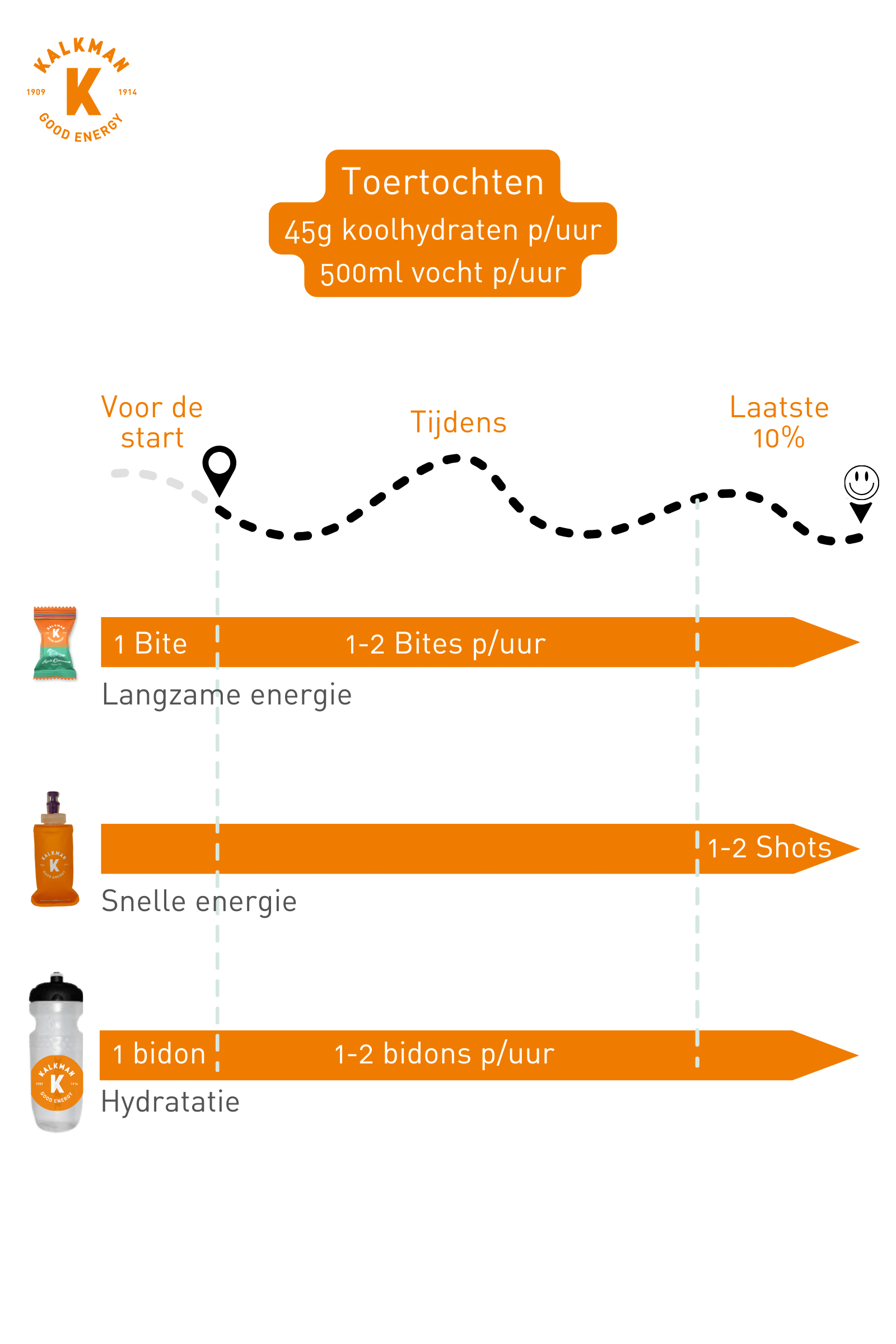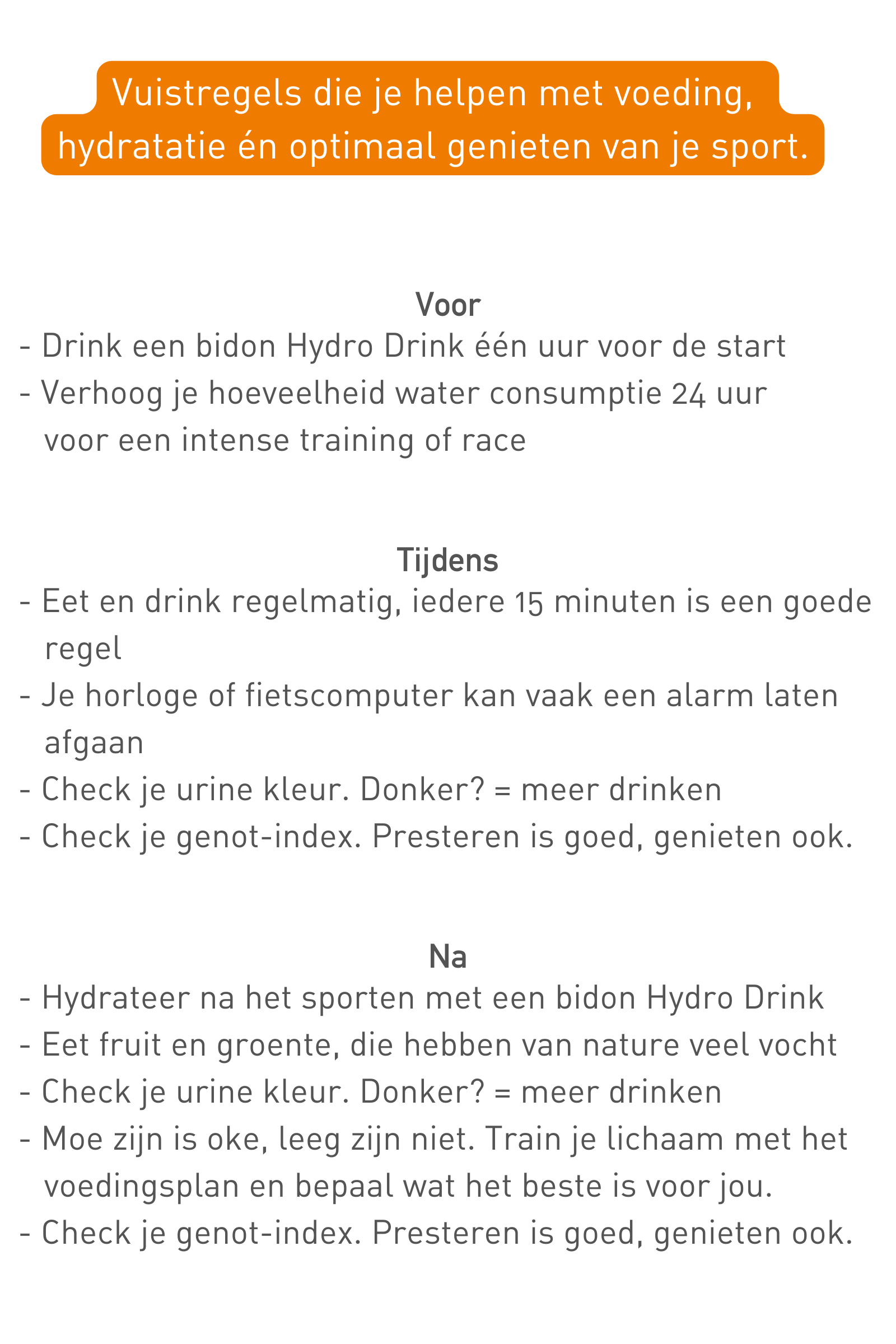 Heel vaak vergeten we wanneer wat te eten en drinken. Dan kan je niet genieten van je toerrit. Vanwege de lengte en intensiteit van je toertocht moeten je energiebronnen worden aangevuld met 45g koolhydraten per uur. Dat betekent in totaal, inclusief Energy Bites, Energy Shots en Hydro Drink. Onze geportioneerde producten bevatten elk ongeveer 15g koolhydraten per portie. Dus met 2 Energy Bites en 1 bidon Hydro Drink kom je op de 45g per uur. Streef naar 500ml per uur met onze Hydro Drink die je elektrolyten aanvult. Je moet altijd rekening houden met individuele factoren, zoals lichaamsgewicht en weersomstandigheden.